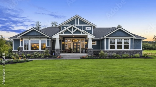 Obraz premium The front view of a newly built home is enhanced by a picturesque surrounding of vibrant green grass and a clear blue sky at sunrise. This appealing exterior beckons potential buyers or renters