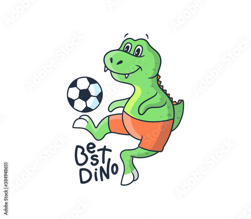 Fototapeta premium The funny dino boy playing soccer. Cartoonish sport dinosaur