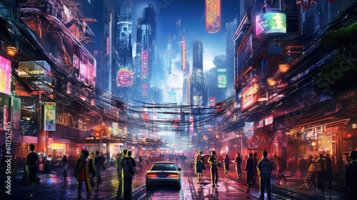 Naklejka premium the futuristic world of artificial intelligence through a captivating technological landscape illuminated by vibrant neon lights