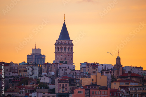 Fototapeta premium The Galata Tower and seagulls at dawn. Magnificent cityscape of Istanbul in...