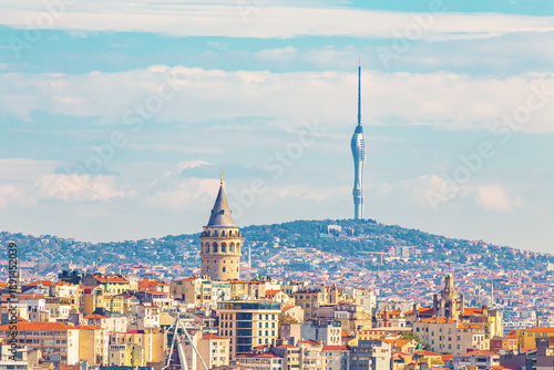 Fototapeta premium The Galata Tower and the Istanbul TV Tower on a sunny day.