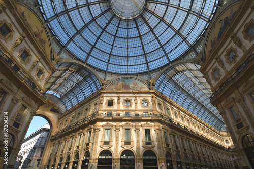 Naklejka premium The Galleria Vittorio Emanuele II is Milan's famous shopping arcade connecting Piazza Duomo to Piazza della Scala. It is renowned for its glass dome, porticoes, and prestigious shops.