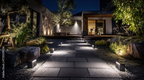 © Babb, Fototapeta premium The garden pathway is beautifully lit at night by subtle lights that guide the way. Surrounding greenery and modern architecture enhance the serene atmosphere of the space.