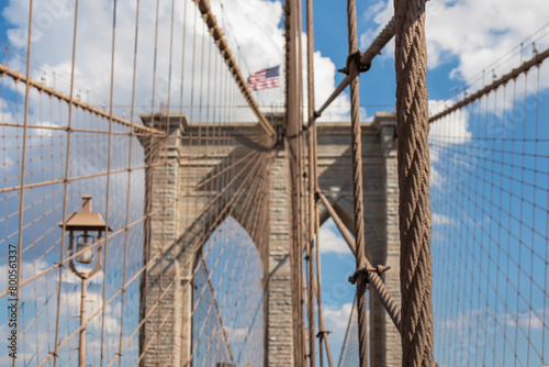 © Chris, Obraz premium The gate of Brooklyn Bridge with a waving American flag on top of it contrasted with a blue sky with puffy, white clouds. Suspension bridge in New York City. Massive construction. Local landmark