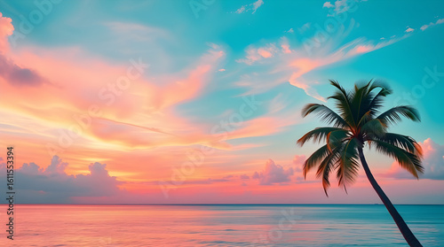 Obraz premium The gentle reflection on the water enhances the dreamlike quality of this tropical evening scene, perfect for illustrating themes of escape, tranquility, and the beauty of nature's artistry