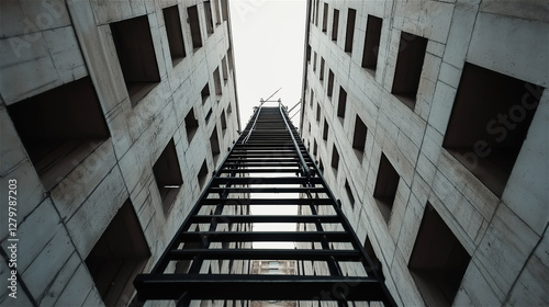Fototapeta premium The geometric pattern of modern buildings creates an abstract urban landscape. The view from the ground upward highlights the structure and design of the city skyline.