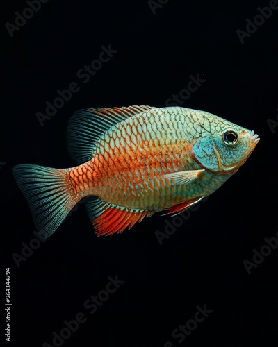 © Eyestetix Studio, Fototapeta premium the Giant Gourami fish, portrait view, white copy space on right, Isolated on black Background