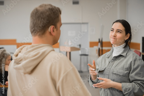 Fototapeta premium The girl and the guy talk in sign language. Two deaf students chatting in a university class.