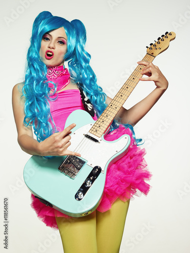© Voloshyn Roman, Obraz premium The girl in anime-style guitar playing.