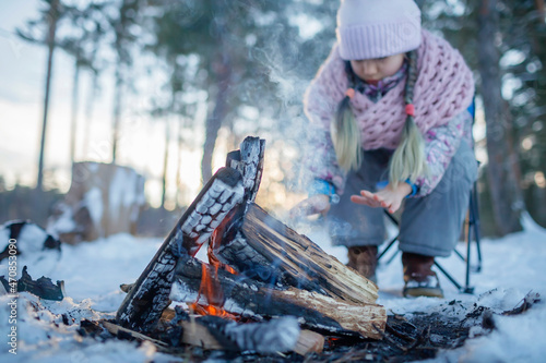 © Maria, Obraz premium The girl in winter clothes warms her hands by the fire in snow-covered forest, winter trip at weekend. Family winter picnic, active lifestyle, focus on woods