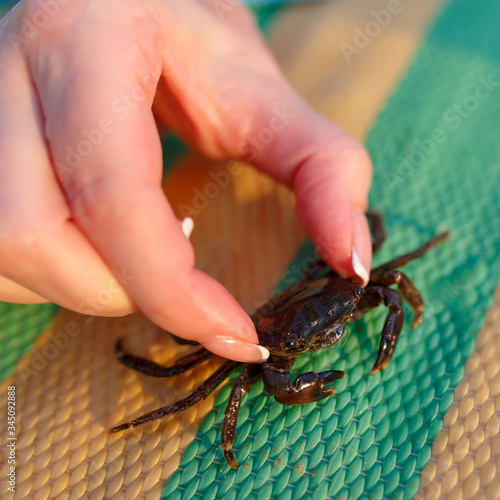 © ovbelov1972, Obraz premium The girl is holding a small crab with two fingers