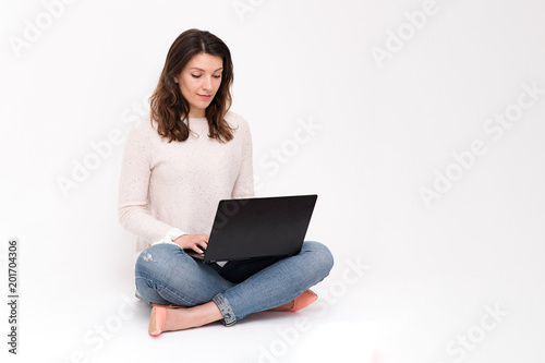 © Вячеслав Чичаев, Naklejka premium the girl is sitting on the floor with a laptop
