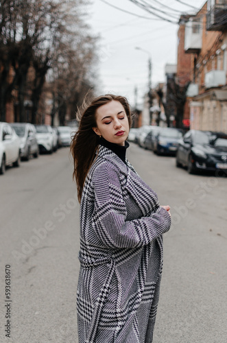 © Владимир Паляница, Fototapeta premium The girl is standing on the street in a gray coat