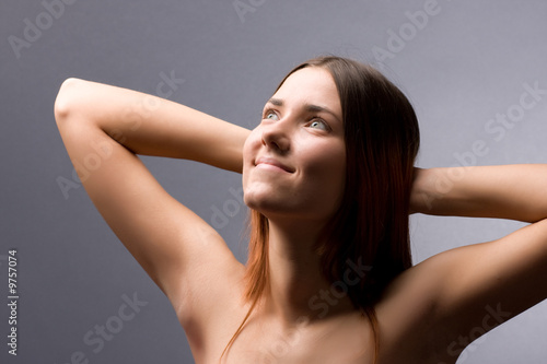 © Pumba, Naklejka premium The girl looks upwards, having thrown hands for a head