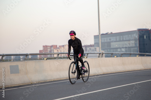 Obraz premium The girl rides a bicycle over the bridge. Morning workout in the city on a...