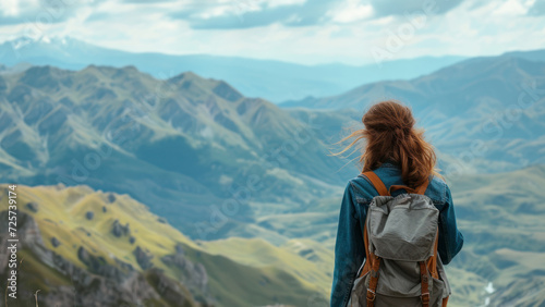 Naklejka premium The girl walks in the mountains and admires the beautiful views.