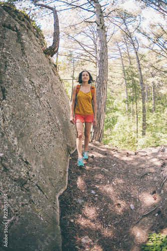 © zhukovvvlad, Naklejka premium The girl with a backpack is walking through the forest.