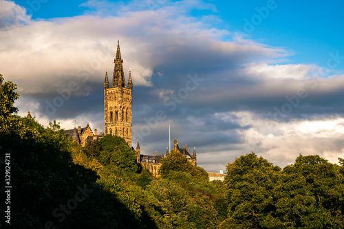 © Maritxu22, Fototapeta premium The Glasgow University tower against dramatic sky behind the trees of Kelvingrove Park at sunset.