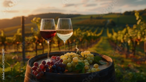 © VIKI, Fototapeta premium The glasses on vineyard barrel