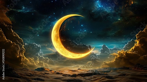 © Pricha.RT, Fototapeta premium The glowing crescent Moon orbiting Earth, set against a galactic backdrop.