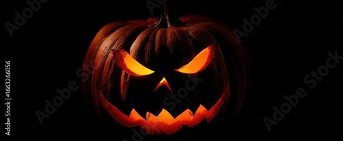 © Miro, Naklejka premium The glowing jack-o-lantern with an eerie expression in darkness.