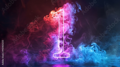 © Cherkasova Alie, Obraz premium The glowing neon number 1 in bright pink and blue tones with the image of smoke on a dark background embodies creativity and energy.