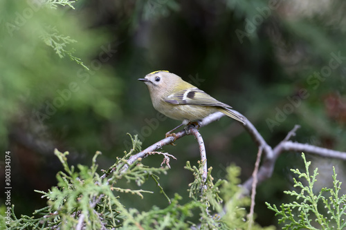 © VOLODYMYR KUCHERENKO, Fototapeta premium The goldcrest (Regulus regulus) portright shot close-up on a thuja branch