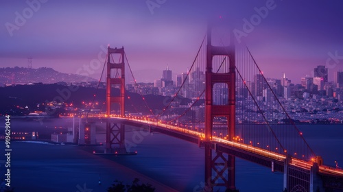 © Thirawat, Obraz premium The Golden Gate Bridge with the city of San Francisco lit up in the distance, showcasing