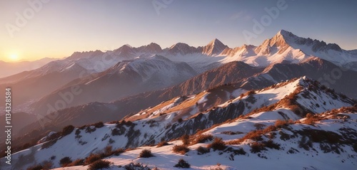 Obraz premium The golden light of sunrise illuminating the snow-capped peaks of the Grand Vilaia hills, mountain scenery, mountains