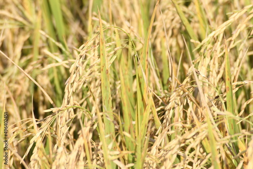 Obraz premium The golden rice fields are germinating and ready to be harvested.