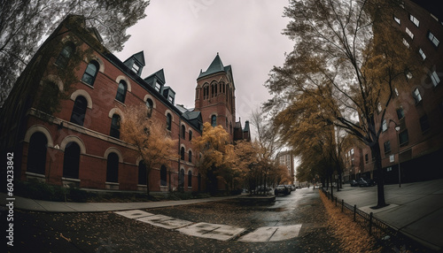 © Stockgiu, Obraz premium The Gothic chapel ancient facade vanishes into the autumn night generated by AI