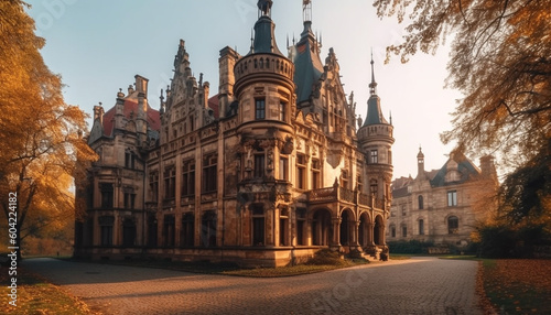 © Stockgiu, Naklejka premium The Gothic style cathedral illuminated the city skyline at dusk generated by AI