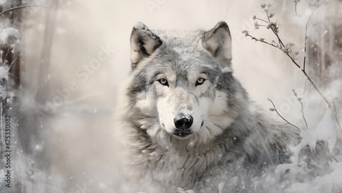 © 대연 김, Fototapeta premium The graceful appearance of a gray wolf looking into the eyes of a photographer