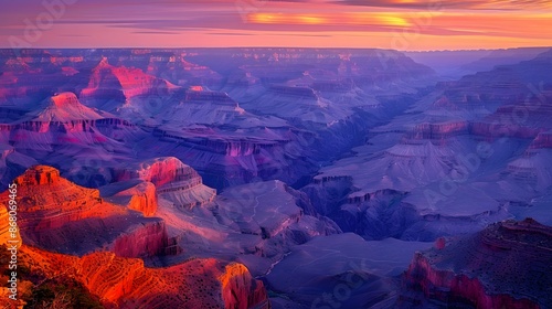 © horizon, Obraz premium The Grand Canyon at dawn, with layers of rock formations illuminated in a palette of red, orange, and purple hues. creating a dramatic and serene landscape.