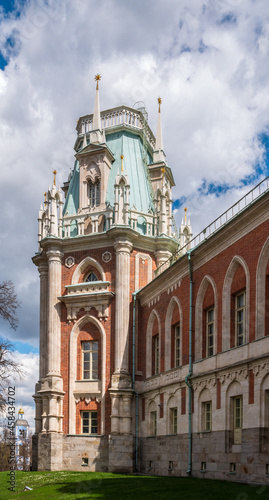© Dmitrii Potashkin, Obraz premium The grand palace in Tsaritsyno park in Moscow on cloudy sky background