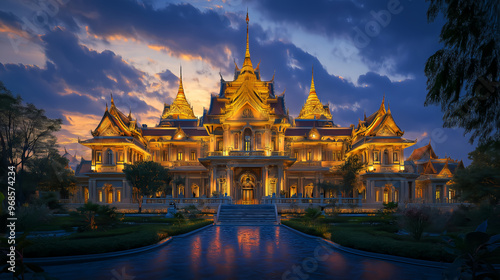 © lareyna, Fototapeta premium the grand palace of bangkok in thailand is illuminated by golden lights during the evening