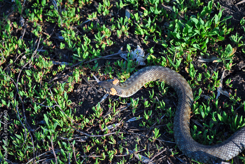 © ArtoPhotoDesigno, Obraz premium The grass snake (Natrix natrix, ringed snake, water snake) crawling on dry ground, top view