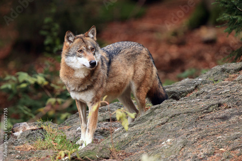 © Karlos Lomsky, Fototapeta premium The gray wolf or grey wolf (Canis lupus) on the rock