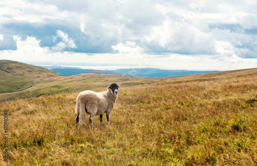 Naklejka premium The grazing big sheep on the meadow against mountains and hills in Lake District on cloudy day