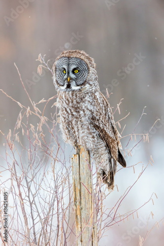 © Hummingbird Art, Fototapeta premium The great grey owl or great gray is a very large bird, documented as the world's largest species of owl by length. Here it is seen searching for prey in Quebec's harsh winter.