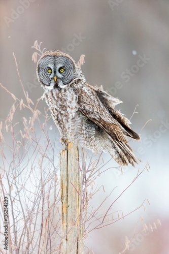 © Hummingbird Art, Fototapeta premium The great grey owl or great gray is a very large bird, documented as the world's largest species of owl by length. Here it is seen searching for prey in Quebec's harsh winter.