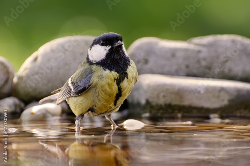 © Milan, Obraz premium The great tit stands in the water of a bird's watering hole. Moravia. Europe.