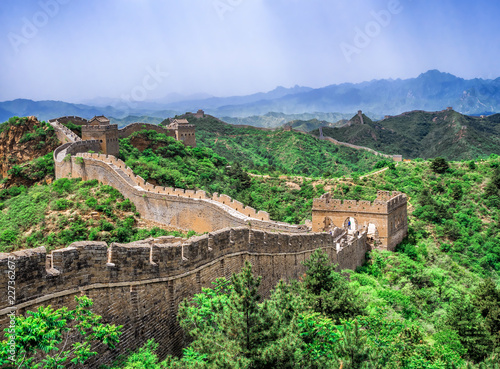 Fototapeta premium The Great Wall Jinshanling section with green trees in a sunny day, Beijing,...