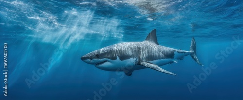 Fototapeta premium The Great White Shark Gliding Through Sunlit Blue Ocean Waters With Calm Majesty