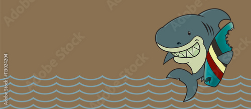 © mangulica, Obraz premium The great white surfer.Funny looking surfer shark cartoon character.Horizontal banner design