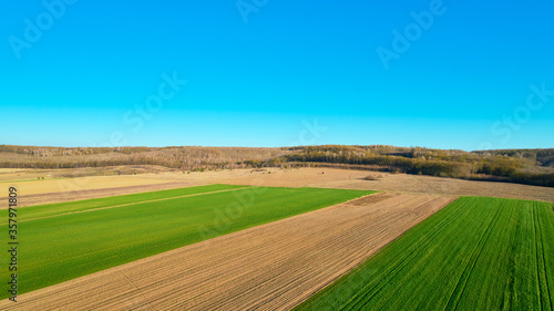 © Ruslan Ivantsov, Obraz premium the green field is at sunset shot with the drone
