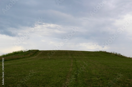 © Al, Obraz premium The green grass hill landscape with the gray clouds in sky.