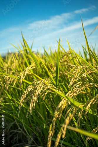 © eikotsuttiy, Fototapeta premium The Green Rice Field bfore Cropping Hastushimo in Gifu, Japan