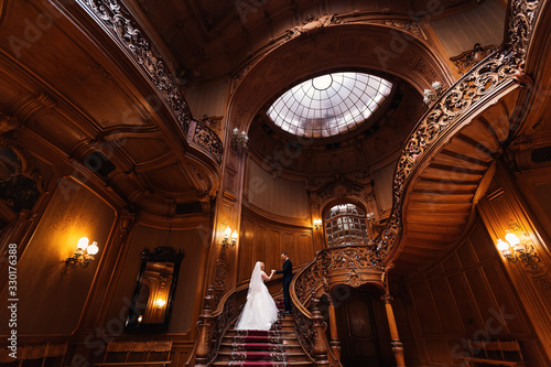 © Ivan, Obraz premium the groom holds the bride by the hand and they climb on wooden c