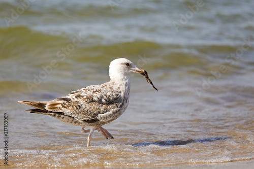 Fototapeta premium The gull in its beak caught algae